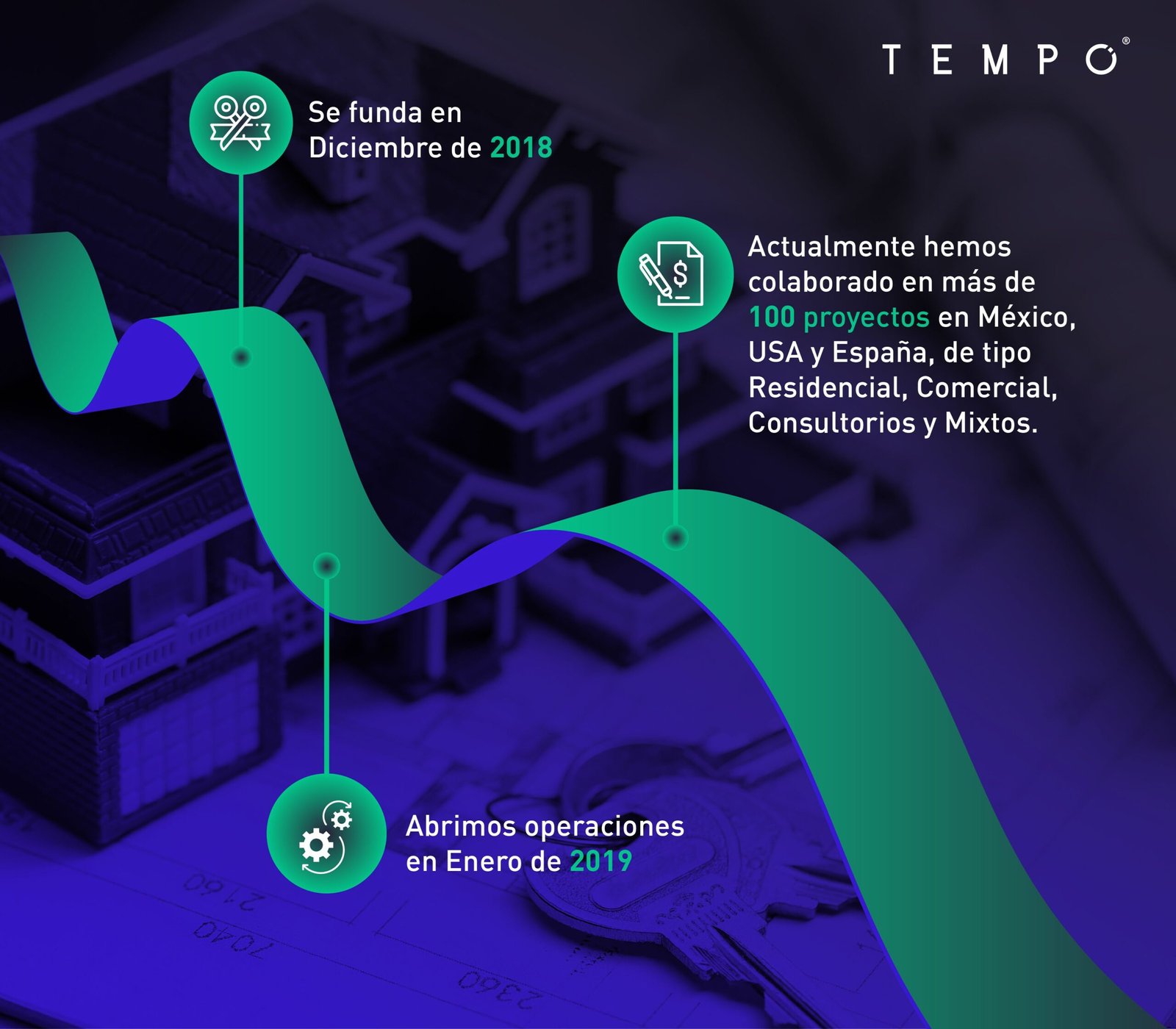 En TEMPO somos un equipo especializado en análisis inmobiliario que brinda herramientas claras, confiables y personalizadas para la toma de decisiones estratégicas. Desde nuestra fundación en diciembre de 2018, hemos participado en más de 100 proyectos en México, Estados Unidos y España, abarcando desarrollos residenciales, comerciales, de oficinas, consultorios y proyectos mixtos.